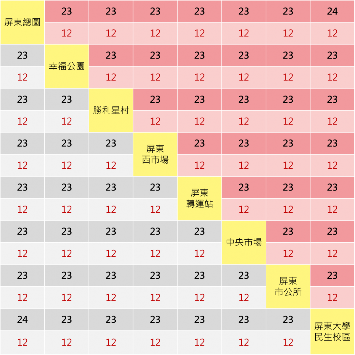 上方為電子票證付費,下方為現金付費;黑色粗體為全票,紅色細體為半票
