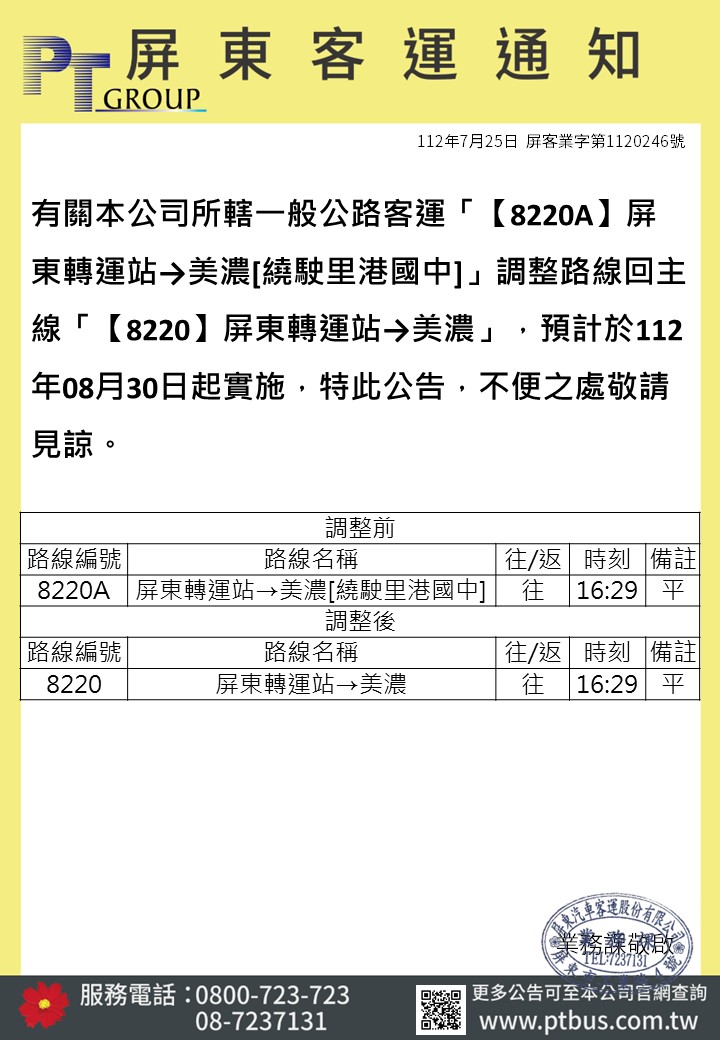 8220A美濃線[繞駛里港國中] 併回8220 美濃線 (8/30~)