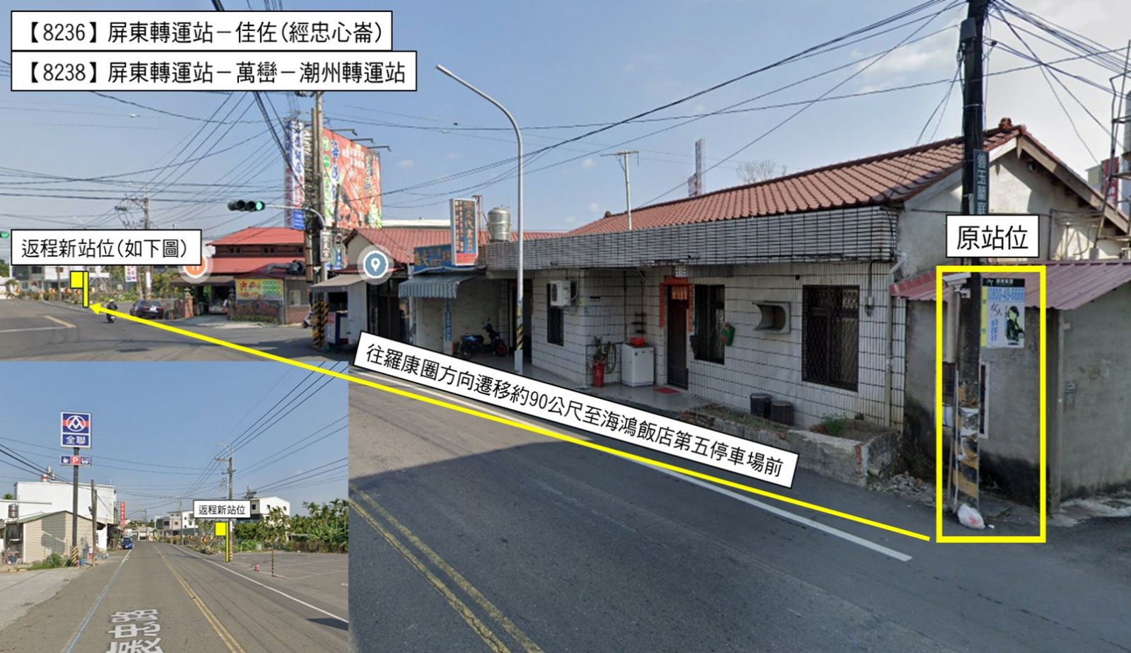 二、 經當地各機關單位會勘後,為改善整體候車環境安全性,將「萬巒」(返程)站往「羅康圈」站方向遷移約90公尺至屏 東縣萬巒鄉褒忠路229-1號對面(海鴻飯店第五停車場前)(如下圖)。