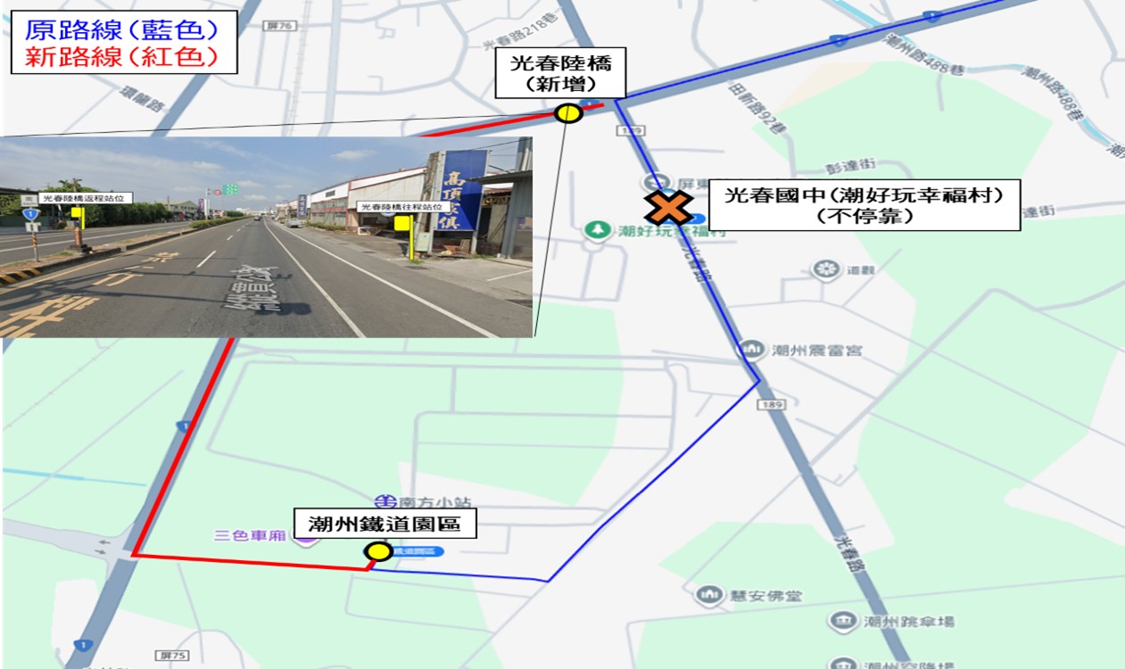 - 經當地各機關單位會勘後,因光春路往潮州鐵道園區大客車通行有安全疑慮,不停靠「光春國中」站,自115年3月2日起試辦不停靠3個月,試辦期滿後,倘無民眾不良反映則正式撤站。