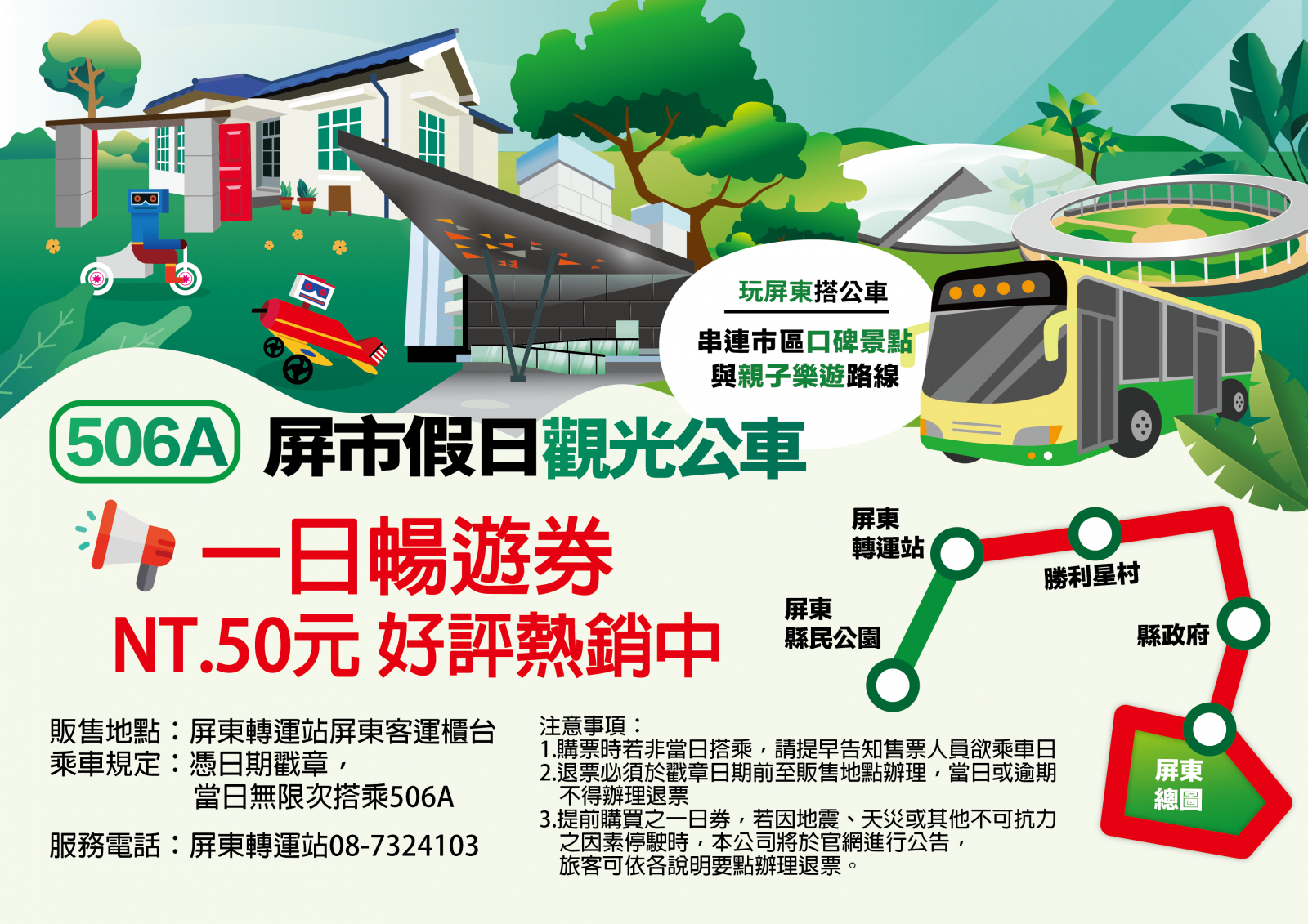 行經絕美殺蛇溪畔縣民公園、懷舊文創園區勝利星村、城市森林屏東總圖三大超夯景點的506A屏市假日觀光公車,推出超激優惠一日券啦