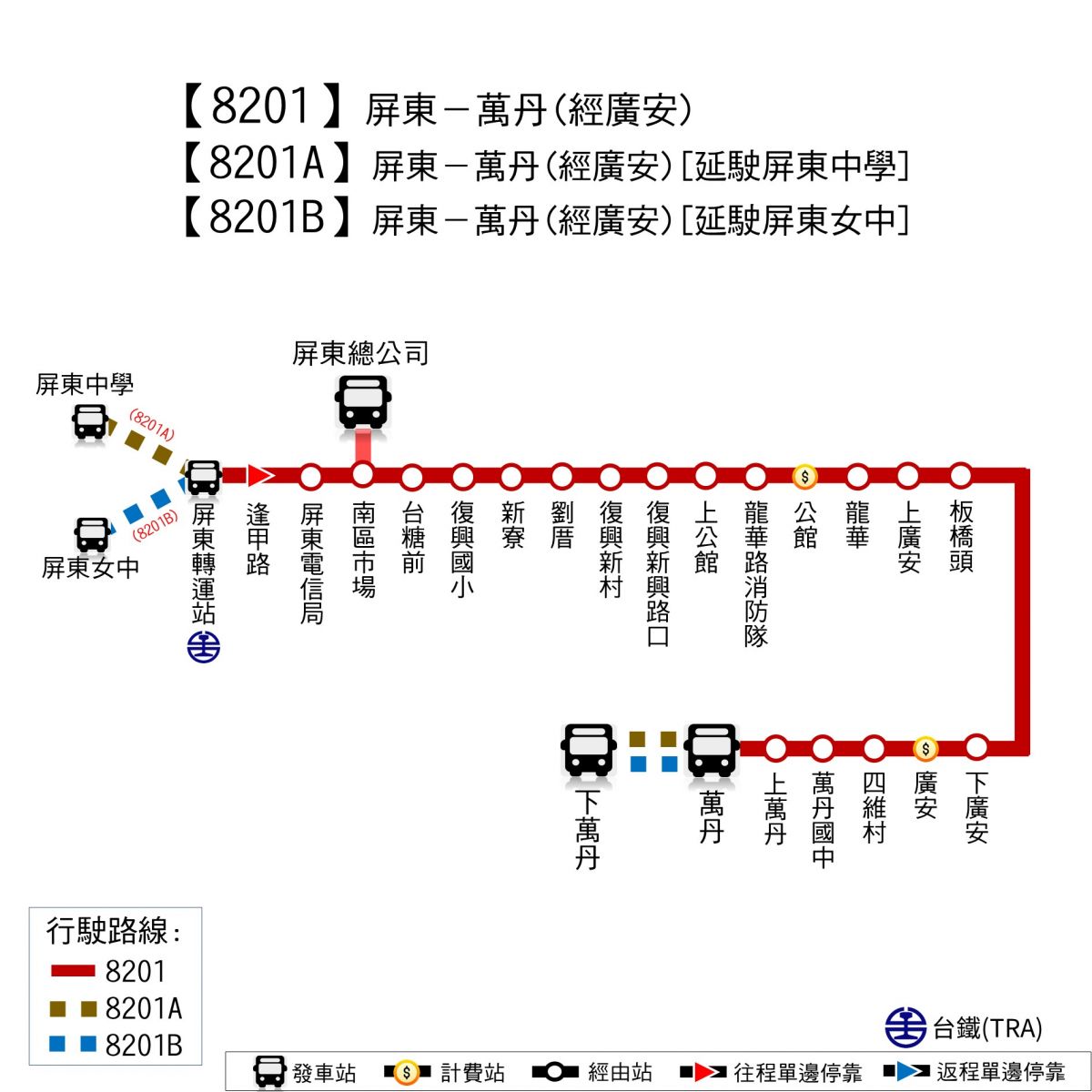屏東 | 屏東中學(支線A)、屏東女中(支線B)、屏東總公司、屏東、屏東電信局、南區市場、台糖前、復興國小、新寮、劉厝、復興新村、復興路教會 |